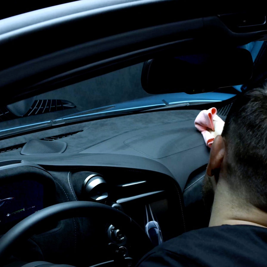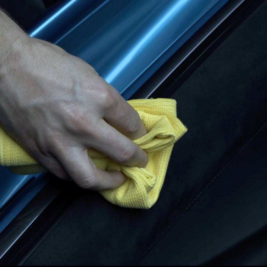 3. Swissvax Quick Interior Finish'i temiz bir Swissvax Micro-Wash mikrofiber beze (sarı) püskürtün ve eşit şekilde dağıtın.